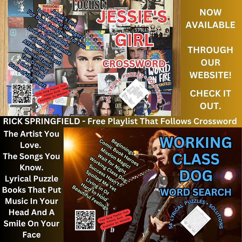 Exclusive Bundle set - now 25 % Off the second book! Featuring RICK SPRINGFIELD in both a word search and a crossword puzzle book dedicated to the artist, you’ll explore lyrics, song titles, and trivia while putting your knowledge to the test. A perfect choice for superfans, road trips, and thoughtful gifts!